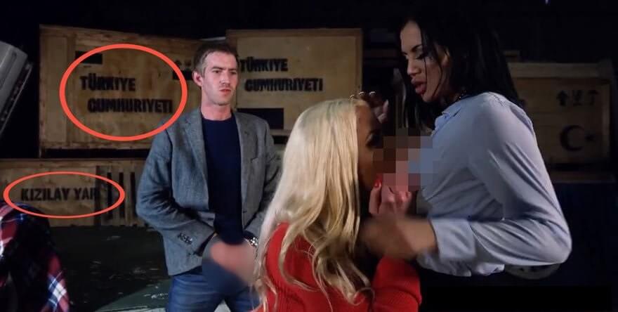 Yetişkinler için hazırlanan ve ABD merkezli bir internet sitesinde yayınlanan filmdeki görüntü, Kızılay yardım kutularının film setinde kullanıldığına dair bir ispat da sunmuyor.