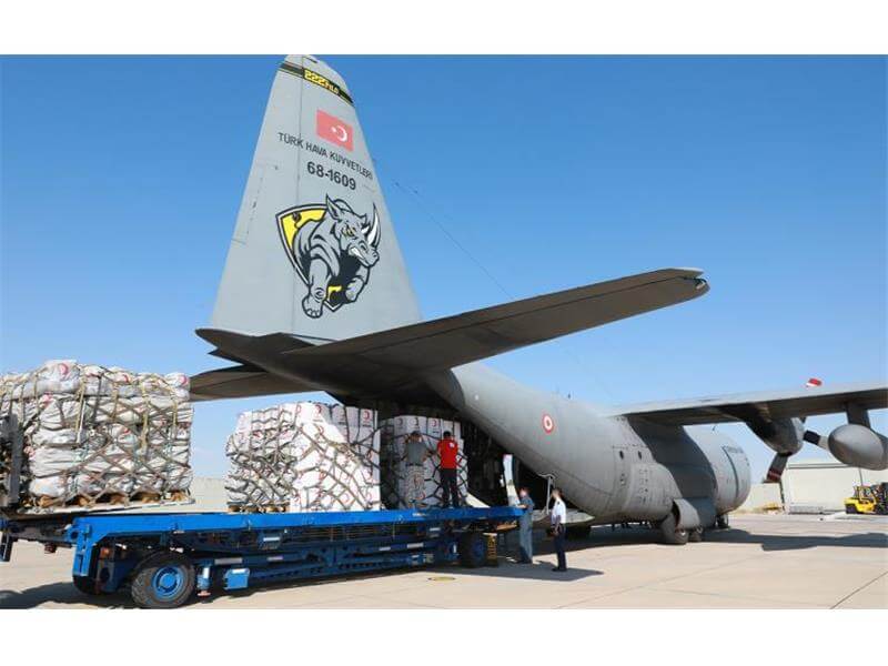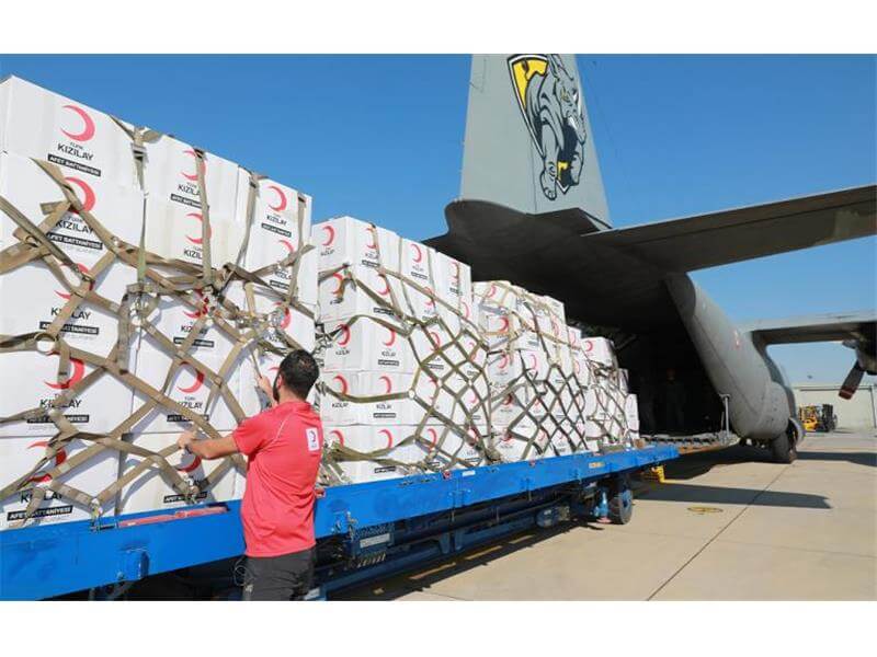 Üzerinde ‘Kızılay Yardım Projesi – Türkiye Cumhuriyeti’ yazan sandıklar dijital müdahale ile görüntüye eklenmemiş.