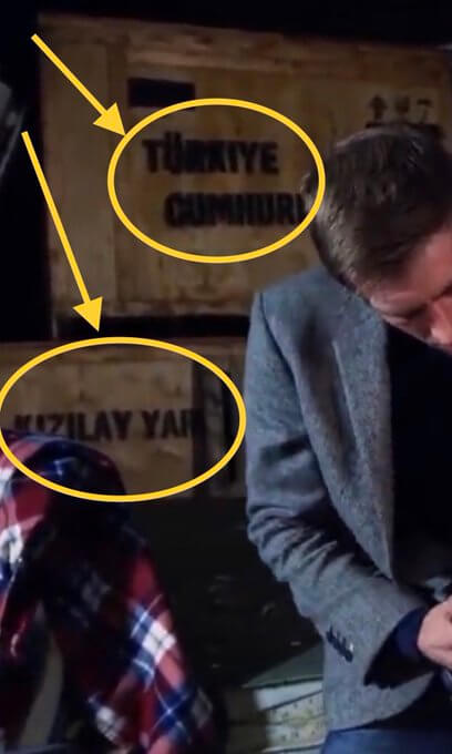 Kızılay’ın yardım sandığında Türkiye Cumhuriyeti ifadesinin ve Türk bayrağının yer alması dikkat çekiyor. Ancak, bir hangarda set dekoru olarak kullanılan ahşap sandıklarda Kızılay’ın yardım paketlerinde yer alan hilal simgesi yerine bayrağımızın simgesi ay yıldızın bulunduğu, Türkçe yazılan Türkiye Cumhuriyeti ifadesinde “i” harfi yerine “ı” harfinin kullanıldığı görülüyor.