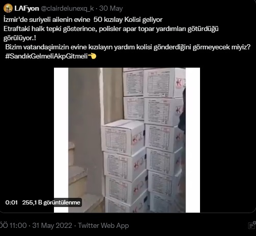 İzmir’de Kızılay’ın bir Suriyeli aileye 50 koli yardım paketi bırakmasına halkın tepki vermesinin ardından polisler tarafından yardım kolilerinin götürüldüğü yönündeki iddia fasılalar hâlinde sosyal medyada zuhur ediyor.