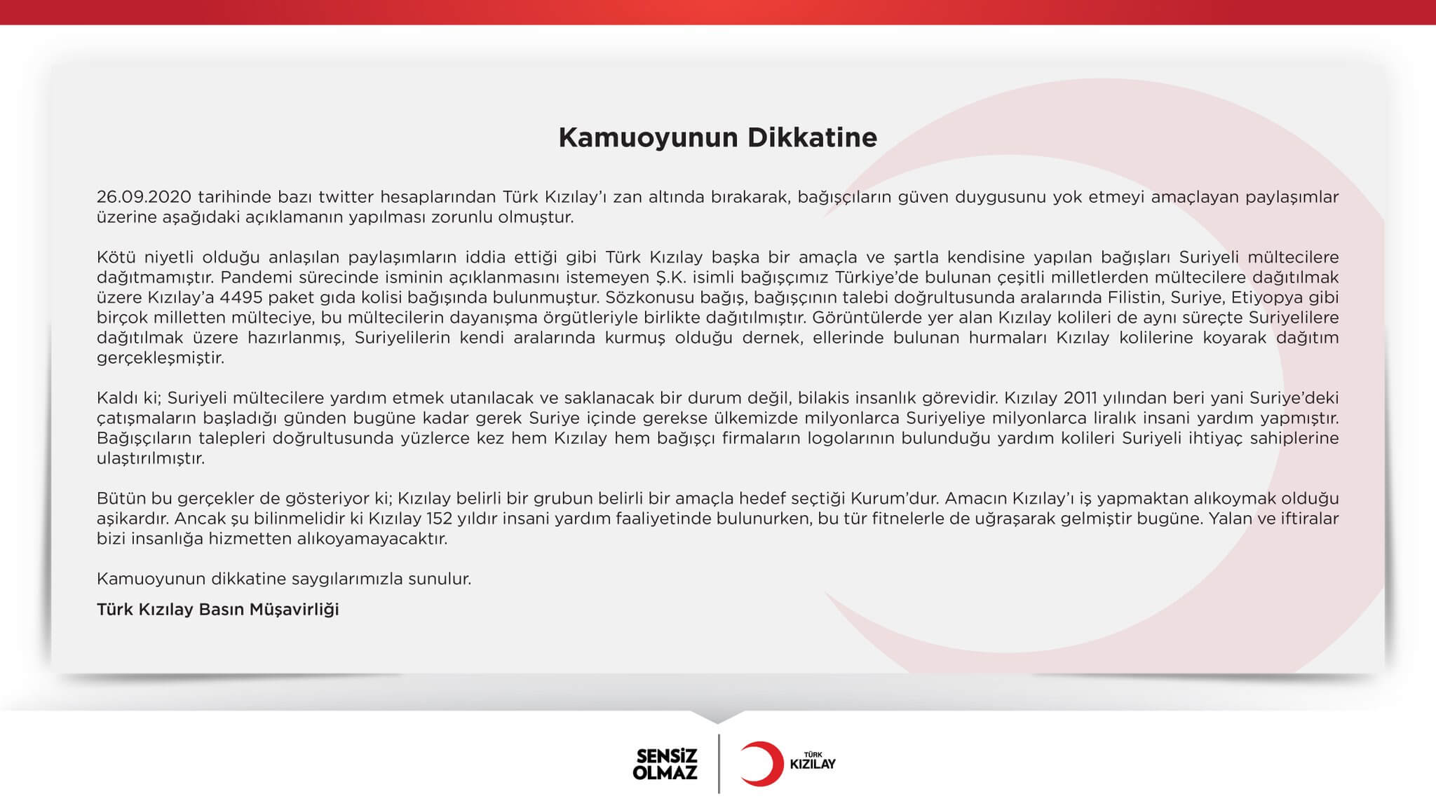 26.09.2020 tarihinde bazı twitter hesaplarından Türk Kızılay’ı zan altında bırakarak, bağışçıların güven duygusunu yok etmeyi amaçlayan paylaşımlar üzerine aşağıdaki açıklamanın yapılması zorunlu olmuştur.