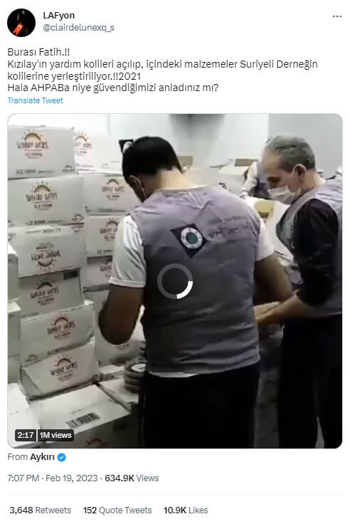 LAFyon (@clairdelunexq_s): “Burası Fatih.!! Kızılay’ın yardım kolileri açılıp, içindeki malzemeler Suriyeli Derneğin kolilerine yerleştiriliyor.!!2021 Hala AHPABa niye güvendiğimizi anladınız mı?”