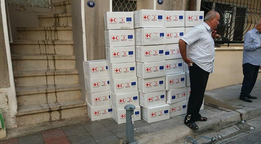 Görüntüdeki kolilerin üzerinde Avrupa Birliği (AB), Uluslararası Kızılhaç ve Kızılay Hareketi (International Federation of Red Cross and Red Crescent Societies – IFRC) ve Kızılay logolarının yer aldığı görülebiliyor.