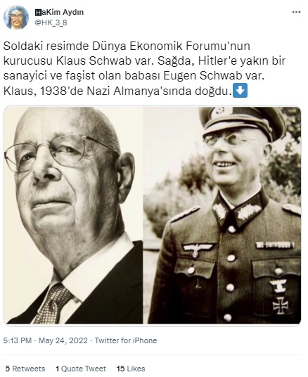 “Soldaki resimde Dünya Ekonomik Forumu’nun kurucusu Klaus Schwab var. Sağda, Hitler’e yakın bir sanayici ve faşist olan babası Eugen Schwab var. Klaus, 1938’de Nazi Almanya’sında doğdu.⬇️