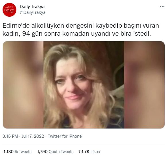 “Edirne’de alkollüyken dengesini kaybedip başını vuran kadının 94 gün sonra komadan uyandığı ve bira istediği” iddiası gerçeği yansıtmıyor.