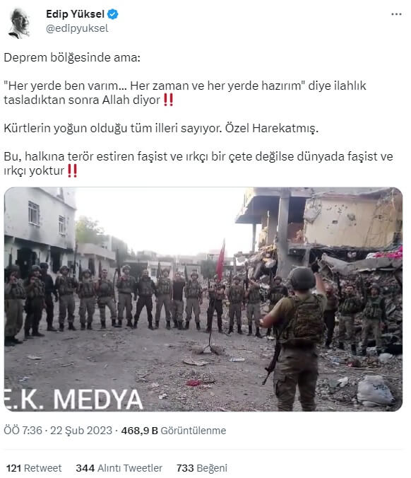 “Deprem bölğesinde ama: “Her yerde ben varım… Her zaman ve her yerde hazırım” diye ilahlık tasladıktan sonra Allah diyor‼️ Kürtlerin yoğun olduğu tüm illeri sayıyor. Özel Harekatmış. Bu, halkına terör estiren faşist ve ırkçı bir çete değilse dünyada faşist ve ırkçı yoktur‼️”