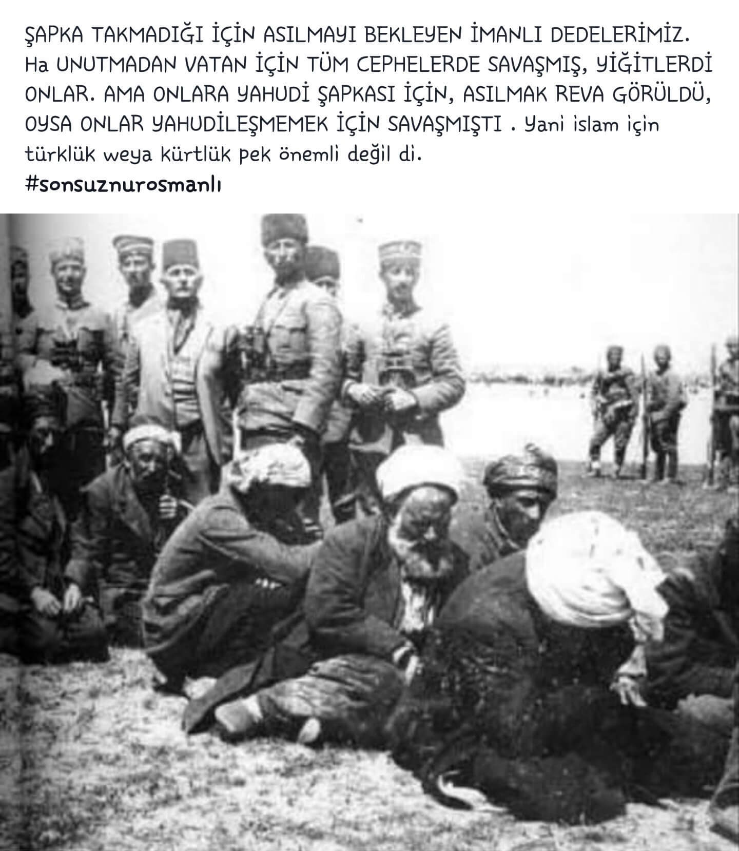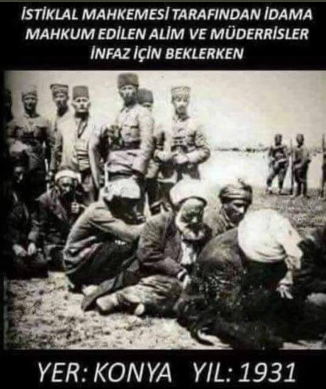 İstiklal mahkemesi tarafından idama mahkum edilen alim ve müderrisler infaz için beklerken – Yer Konya Yıl 1931” ve “Şapka takmadığı için asılmayı bekleyen imanlı dedelerimiz” gibi notlarla söz konusu fotoğrafı paylaşan örnekler şöyle sunulabilir: