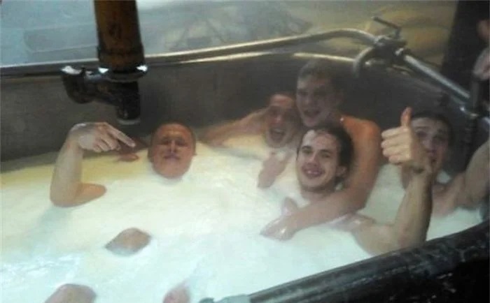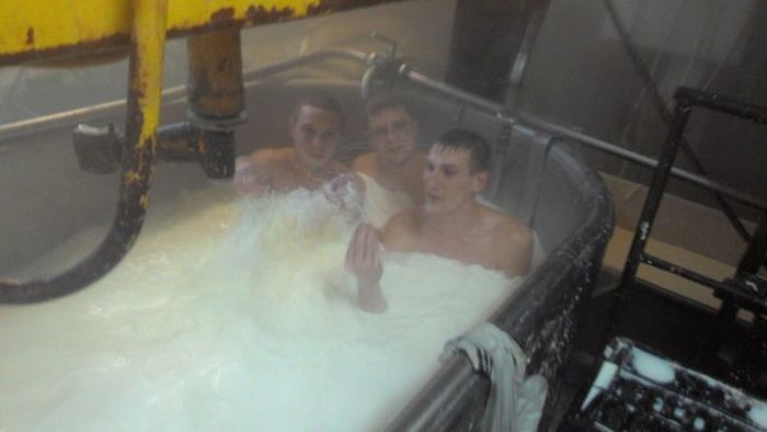 Rusya’nın Omsk şehrinde bir peynir üretim atölyesinde çalışan işçilerin süt ile banyo yaptığı kayıttan görseller şu şekilde idi: