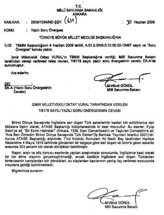 Dönemin Milli Savunma Bakanı Vecdi Gönül tarafından ilgili soru önergesine verilen yanıtta, Osmanlı askerlerinin kör olmasına sebep olanların İngilizler olduğu kabul edilmekle birlikte; Osmanlı askerlerinin kör edilmelerinin kasti yapılmadığı, yanlış ilaç verilmesi sonucu böyle bir olayın gerçekleştiği belirtilmişti.