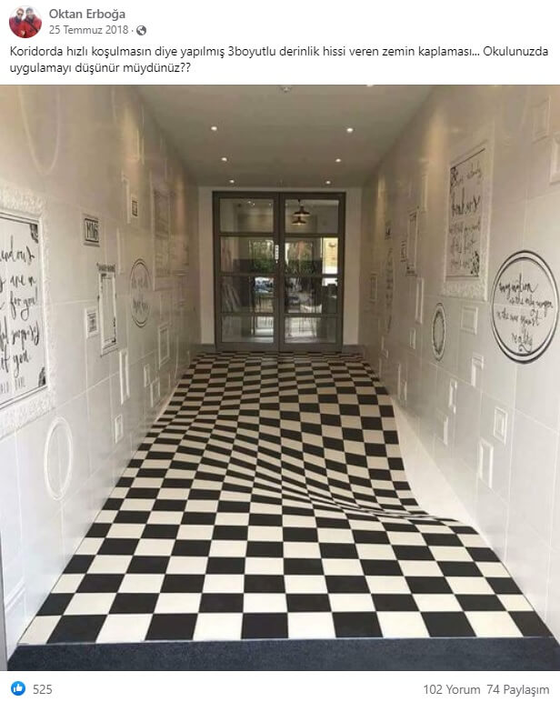 İşin aslı: Sanal alemde karşılaşılan bir optik illüzyon içeren zemin kaplaması görseli üzerine okul koridorlarında koşan çocukların engellenme amacı ile ilgili hikâye uydurulmuş.
