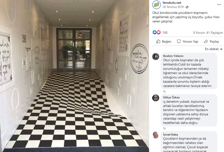 “Koridorda hızlı koşulmasın diye yapılmış 3boyutlu derinlik hissi veren zemin kaplaması… Okulunuzda uygulamayı düşünür müydünüz??”