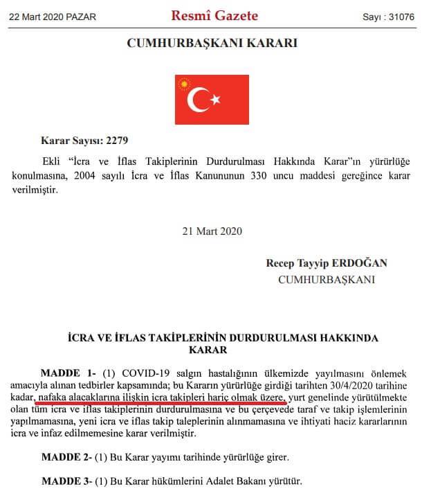 Adalet Bakanlığı’nın bu yönde alındığını açıkladığı bir tedbir de 22 Mart 2020 tarihinde Resmi Gazete’de yayınlanan “nafaka haricindeki tüm icra ve iflas takiplerinin, salgının yayılmasını önlemek amacıyla durdurulması” hakkındaki Cumhurbaşkanı Kararı olmuştu.