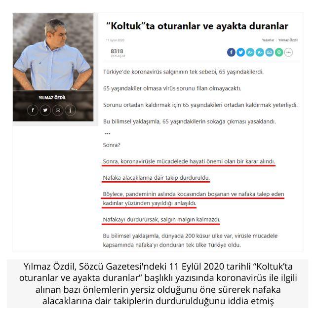 Sözcü gazetesi yazarı Yılmaz Özdil, 11 Eylül 2020 tarihinde yayınlanan “Koltuk’ta oturanlar ve ayakta duranlar” başlıklı yazısında koronavirüs ile ilgili alınan bazı önlemlerin yersiz olduğunu öne sürerek nafaka alacaklarına dair takiplerin durdurulduğunu şu cümleler ile iddia etmiş: