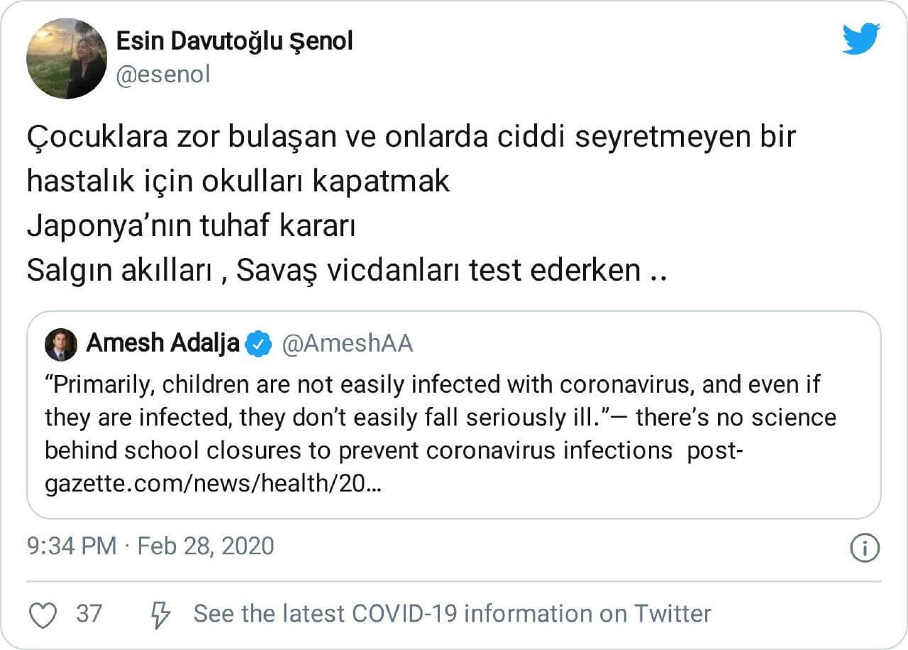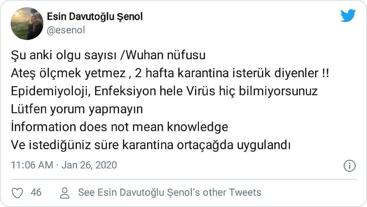 T24’te yazıları da yayımlanan Esin Davutoğlu Şenol, salgının ilk gözlemlendiği dönemlerde Türkiye’de salgın riskinin olmadığı, maske takmanın gereksiz olduğu, yaygara ve cehalet ürünü olarak tanımladığı karantinanın ortaçağda kullanıldığını ve lüzum olmadığını, okulları kapatmamak gerektiği gibi yersiz ve talihsiz yorumlarda bulunmuştu.
