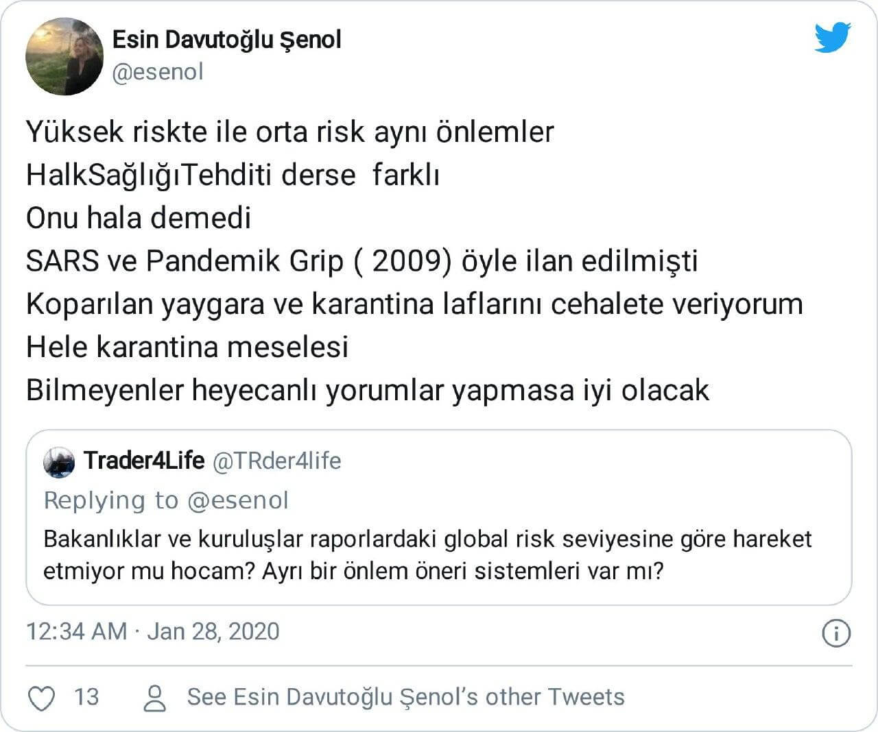 “Yüksek riskte ile orta risk aynı önlemler HalkSağlığıTehditi derse farklı Onu hala demedi SARS ve Pandemik Grip ( 2009) öyle ilan edilmişti Koparılan yaygara ve karantina laflarını cehalete veriyorum Hele karantina meselesi Bilmeyenler heyecanlı yorumlar yapmasa iyi olacak”