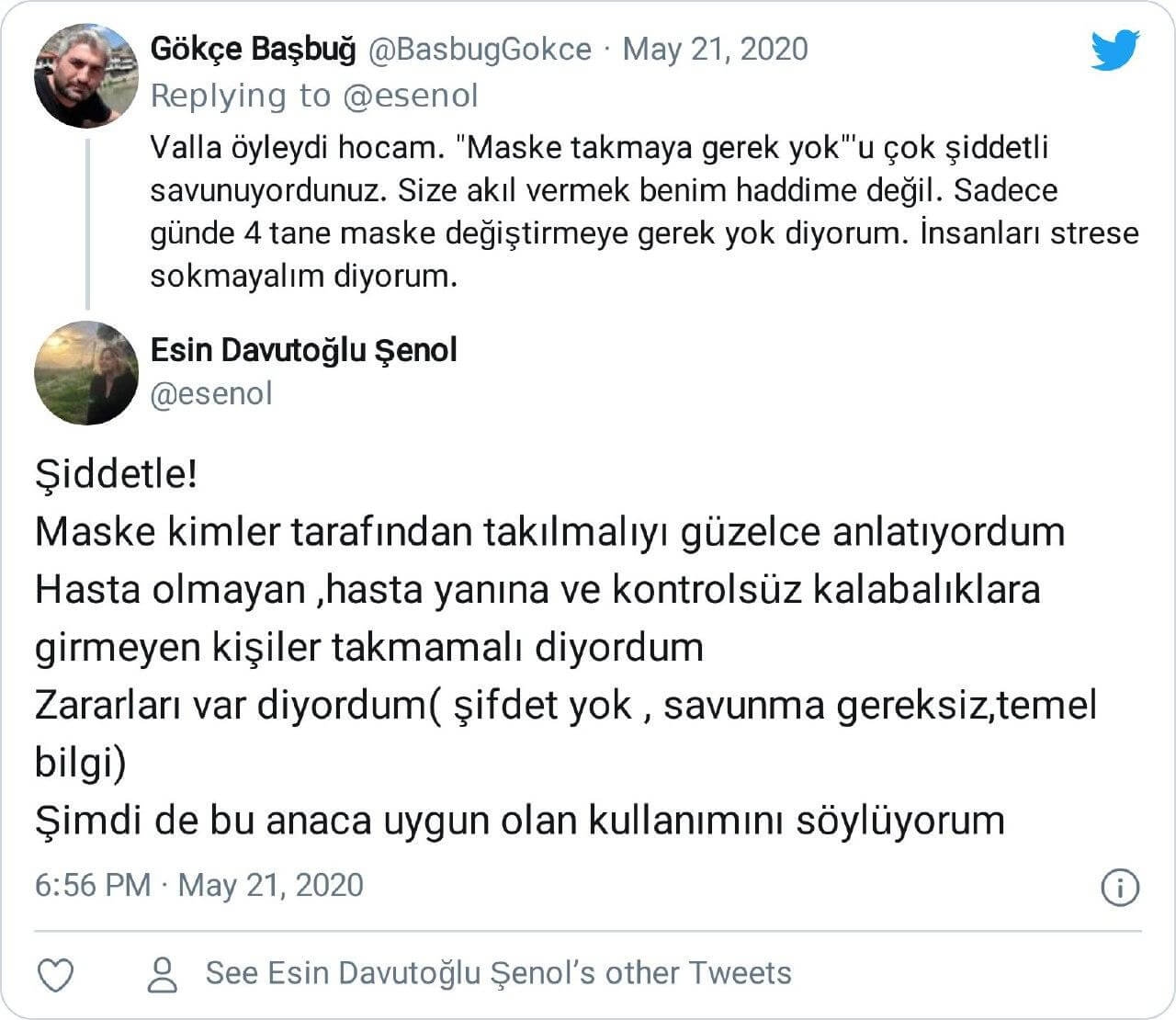 Salgının Türkiye’de yayılması ve maske çağrılarının yaygınlaşması akabinde Esin Şenol, maske kullanımı hakkında “gereksiz” yorumunda bulunmadığını öne sürmüştü.