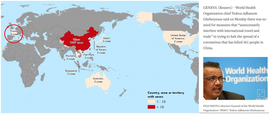 (DSÖ’nün 25 Ocak 2020 günü resmi sitesinde yayınladığı haritada virüsün Çin dışına yayıldığı görülüyor ama DSÖ başkanı 3 Şubat 2020’de salgın nedeniyle “seyahat ve etkinlikleri engelleyecek bir durum yok” açıklaması yaptı)