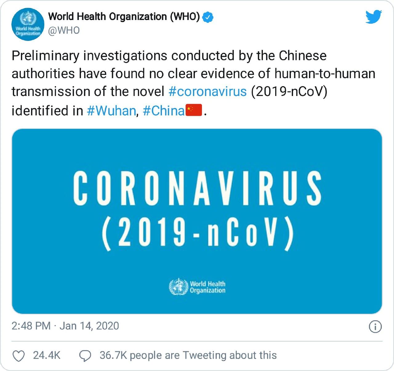 Oysa Dünya Sağlık Örgütü Çin’in yetersiz bilgilendirmesine güvenerek, kendi araştırmasını yapmadan,14 Ocak 2020’de resmi olarak tarihi yanılgılarından biri olan resmi açıklamasında; “Çinli yetkililer yaptığı ön soruşturmada Wuhan’da tespit edilen yeni tip koronavirüsün insandan insana bulaştığına dair kesin bir kanıt bulamadı” demişti.