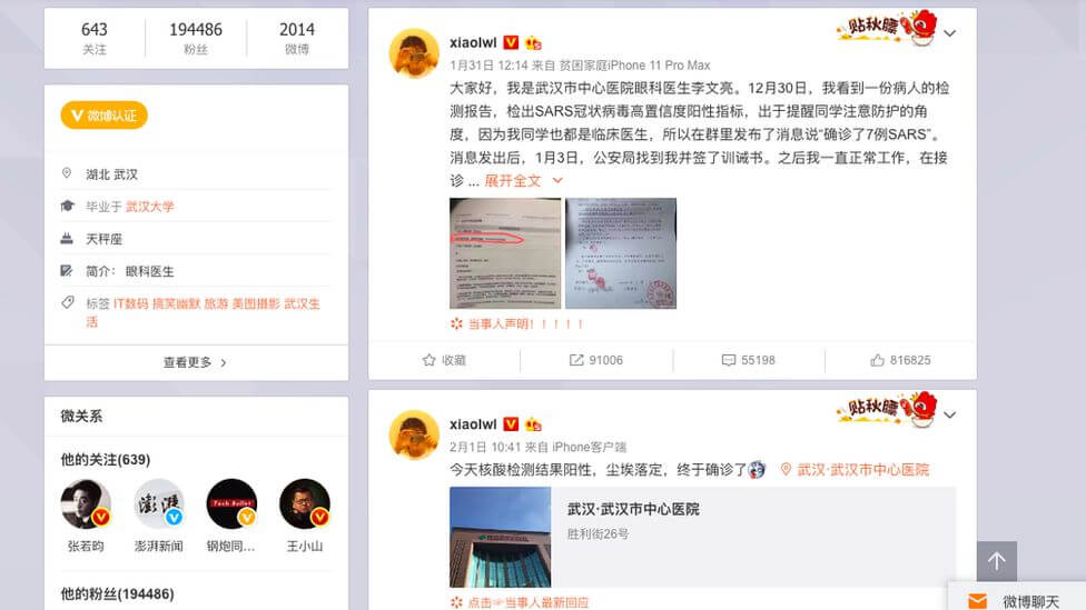 10 Ocak 2020’de kendi bloğunda Dr. Li, öksürük şikayeti ve sonrasında ateşi olduğunu yazdı.