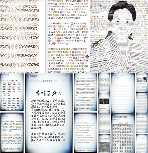 (Salgını ilk duyuran Dr. Ai Fen ve Covid-19 hakkındaki blog yazıları, Çin sosyal medyasında yayınlandıktan sonra hızla hükümet tarafından sansüre uğruyor ve ortadan kayboluyordu. İnsanlar Çin hükümetinin sosyal medyada belirli kelime ve cümleleri tespit ederek mesajları sildiği için bu tür sansür araçlarına yakalanmamak için blog yazısını İngilizce, Almanca, Japonca, emoji, Braille, Mors, DNA kodu gibi bir çok farklı formda yeniden yayınlandılar.)