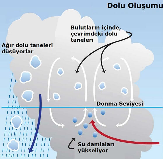 Dolu, içerisinde çok güçlü dikey alçalıcı ve yükselici hava hareketlerinin olduğu Cumulonimbus (Cb) bulutundan düşer.