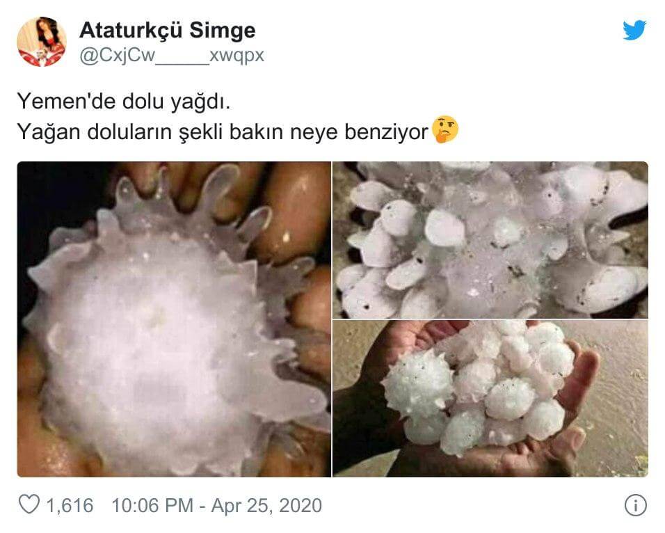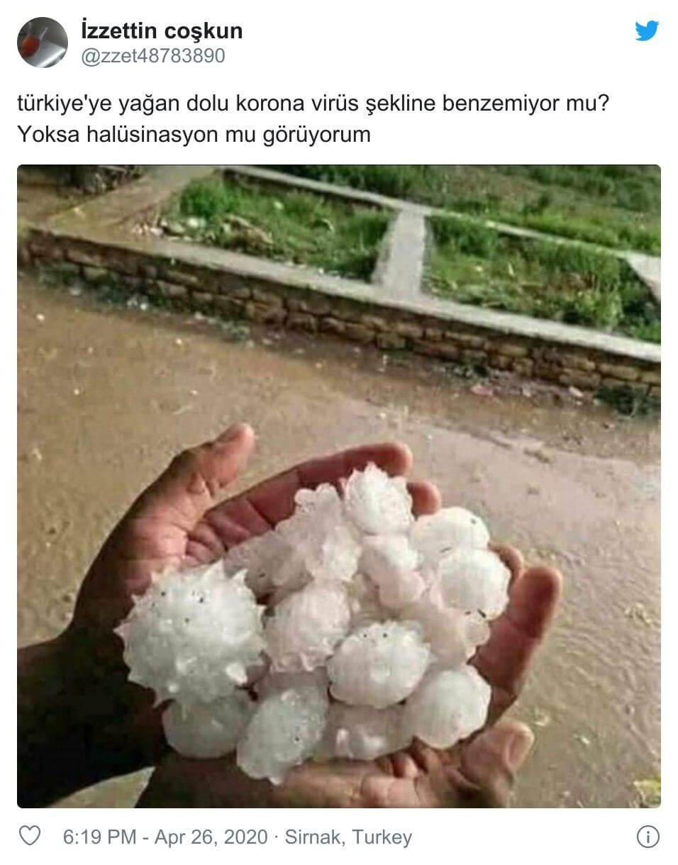 “Türkiye’ye yağan dolu korona virüs şekline benzemiyor mu? Yoksa halüsinasyon mu görüyorum”