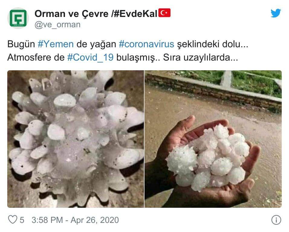 “Bugün Yemen de yağan coronavirus şeklinde dolu… Atmosfere de Covid-19 bulaşmış.. Sıra uzaylılarda…”