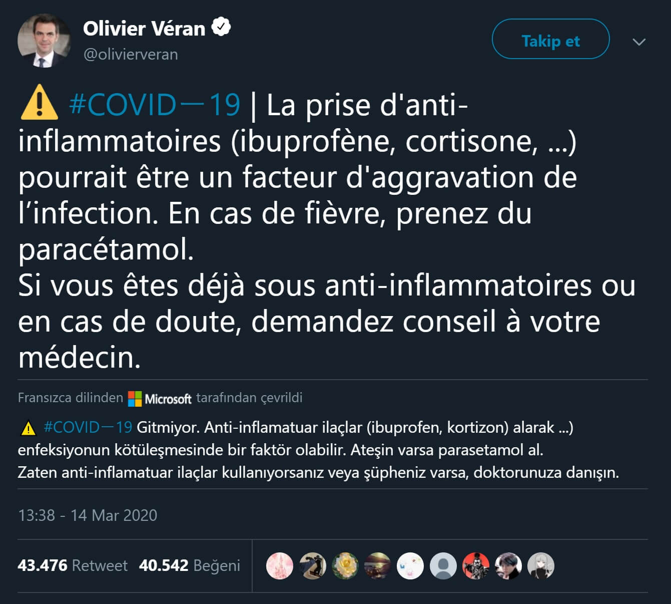 Bu konu hakkındaki ilk iddialardan birisi Fransa Sağlı Bakanı Olivier Veran’dan geldi. Veran bu iddiasını Twitter hesabından “Ibuprofen, kortizon gibi anti enflamatuar ilaçlar kullanmak enfeksiyonunuzu kötüleştirebilir, ateşiniz varsa parasetamol alın. Zaten anti-enflamatuar ilaçlar kullanıyorsanız veya şüpheniz varsa, doktorunuza danışın.” iddiasıyla paylaştı.