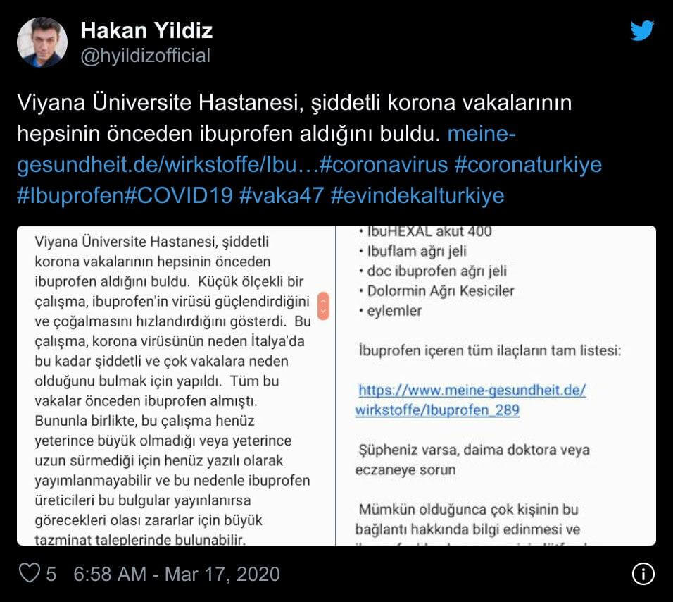 Viyana Üniversite Hastanesi’nin şiddetli vakaların hepsinin daha önceden ibuprofen aldığını iddia ettiğini öne süren paylaşım
