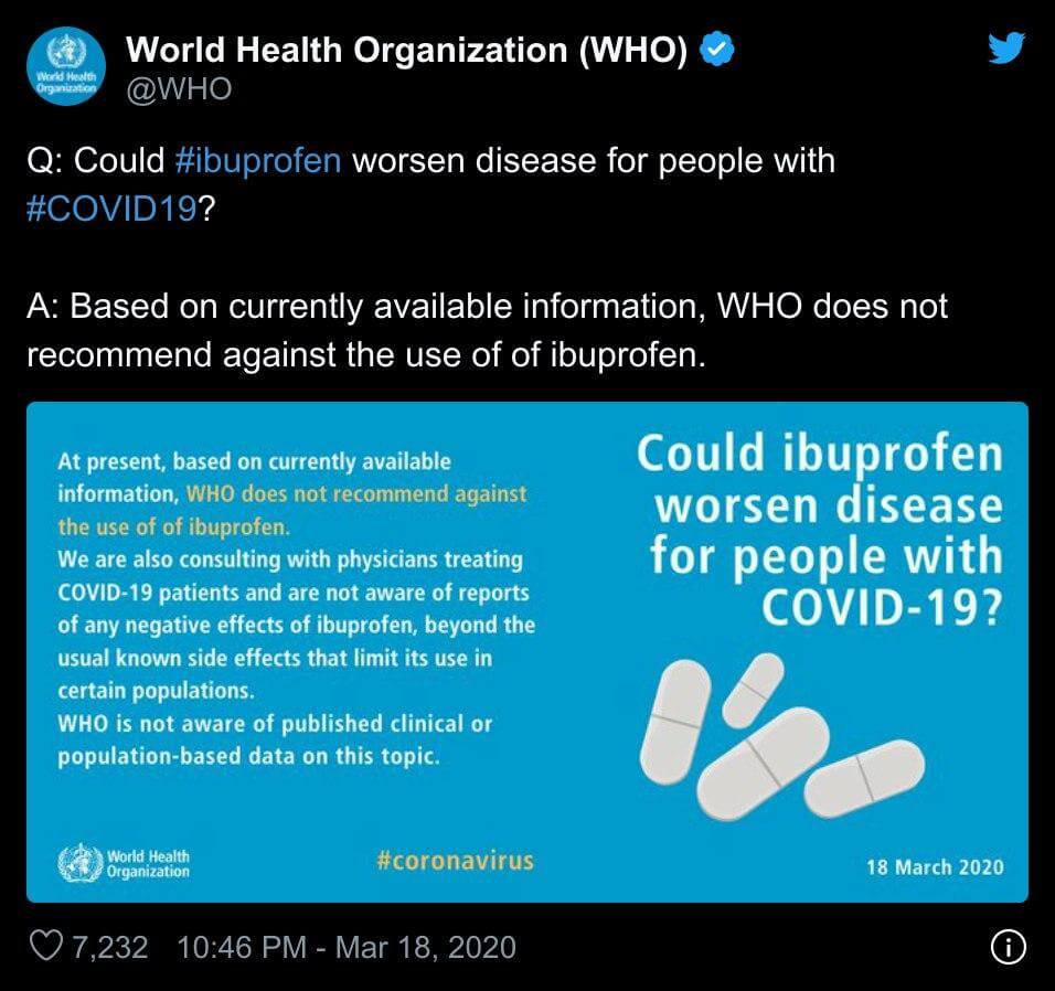 İbuprofen kullanımına karşı tavsiyede bulunmadığını beyan eden Dünya Sağlık Örgütü’nün bu konuyla ilgili 18 Mart tarihli açıklaması şu şekilde: