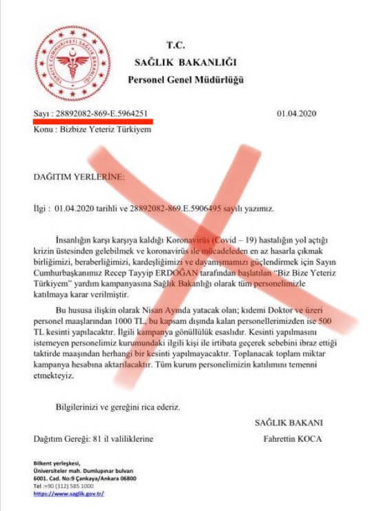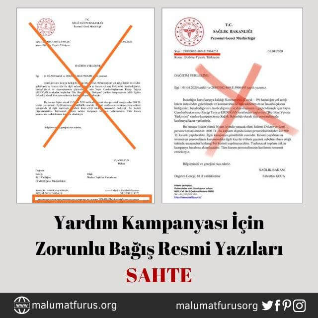 Cumhurbaşkanı Recep Tayyip Erdoğan’ın “Biz Bize Yeteriz Türkiyem” çağrısıyla başlattığı milli dayanışma kampanyası için öğretmenlerin ve sağlık personelinin maaşlarından zorunlu bağış kesintisi yapılacağına yönelik sahte resmi yazı görselleri sosyal medyada paylaşıldı. Sahte olduğunu kavrayamayan birçok sosyal medya kullanıcısı da bu görsele atıfla kamu personelinin maaşlarından zorunlu bağış kesintisi yapılmasına tepki gösterdi.