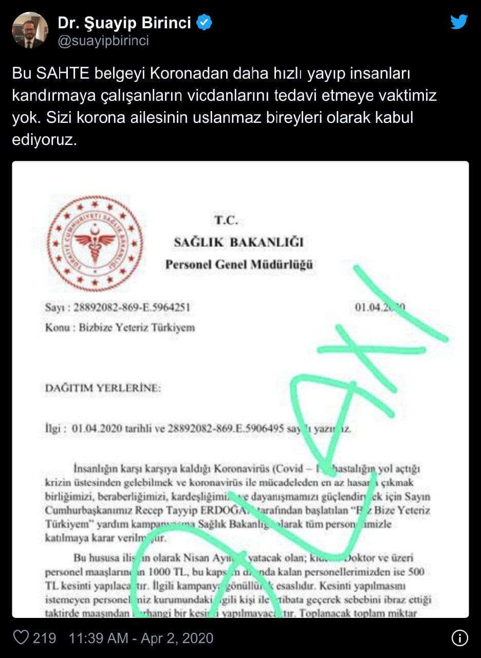 Sağlık Bakan Yardımcısı Şuayip Birinci de sosyal medya hesabından yaptığı paylaşımda “Biz Bize Yeteriz Türkiyem” adlı yardım kampanyası için sağlık personelinin maaşlarından kesinti yapılacağı iddiasının aktarıldığı yazı görselinin sahte olduğunu duyurmuştu: