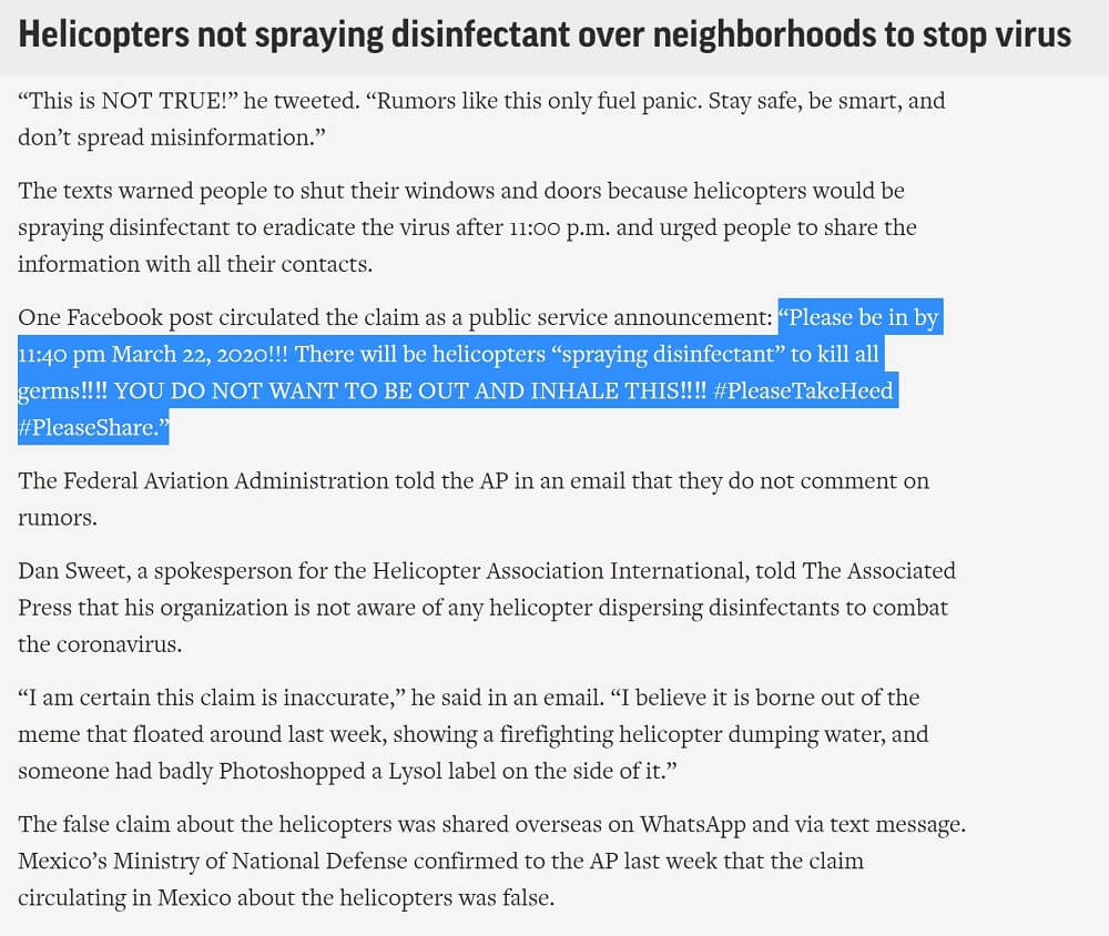 Metin içeriğindeki anahtar kelimeler olan “helikopter sprey dezenfektan” kelimelerinin İngilizce karşılıklarıyla bir tarama yaptığımızda karşımıza AP’nin 24 Mart 2020 tarihli “Helikopterler virüsü durdurmak için mahallelere dezenfektan püskürtmüyor” (“Helicopters not spraying disinfectant over neighborhoods to stop virus“) başlıklı incelemesi çıkıyor.
