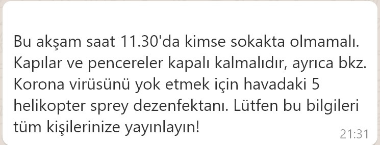 Vatandaşları helikopterlerin saat 11: 00’de koronavirüsü ortadan kaldırmak için dezenfektan püskürtecekleri yönünde uyaran ve bu iddiayı tüm irtibatlarıyla paylaşmaya çağıran bu metnin asılsız olduğu ilk görüşte anlaşılabiliyor. Ancak, ciddiye alan kişi sayısı bir hayli yüksek.