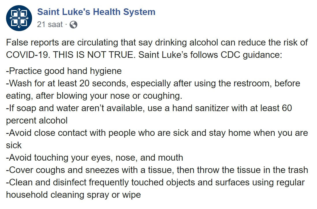 Saint Luke Hastanesi’nin koronavirüse ilişkin duyurularını paylaştığı sayfada da alkol tüketiminin koronavirüsü önlendiğine dair bir bilgi yer almamaktadır. Anılan sayfada alkolle ilgili tek atfın sağlık kuruluşlarının yaptığı ellerin 20 saniye boyunca sabun ve suyla sık sık yıkanması veya alkol bazlı el dezenfektanın kullanılması ile ilgili olduğu görülmektedir.