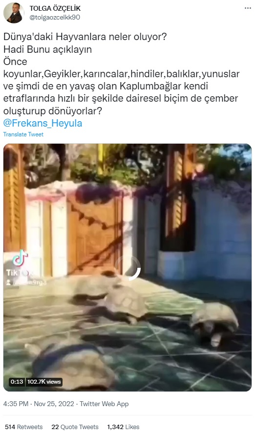 Tolga Özçelik: Dünya’daki Hayvanlara neler oluyor? Hadi Bunu açıklayın Önce koyunlar, Geyikler, karıncalar, hindiler, balıklar, yunuslar ve şimdi de en yavaş olan Kaplumbağlar kendi etraflarında hızlı bir şekilde dairesel biçim de çember oluşturup dönüyorlar?