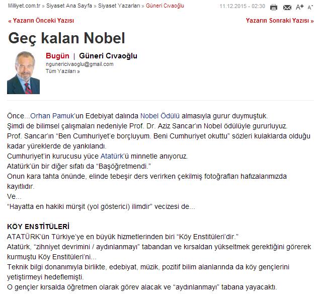 Güneri Cıvaoğlu, Milliyet Gazetesi’nde yayınlanan 11 Aralık 2015 tarihli “Geç kalan Nobel” başlıklı yazısında Köy Enstitülerini Atatürk’ün kurduğunu iddia etmiş: