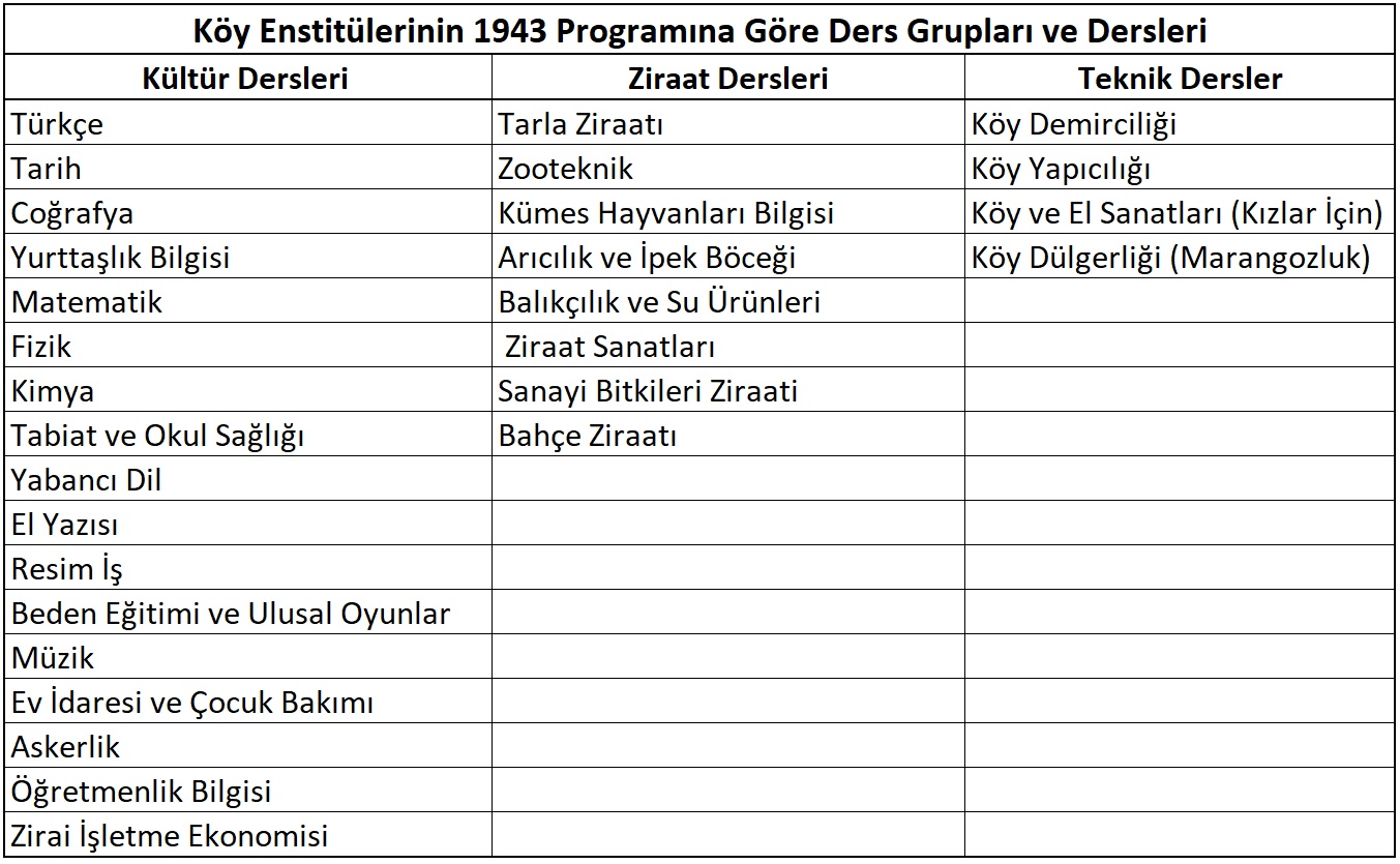 - Kültür Dersleri ve Çalışmaları: Türkçe, tarih, coğrafya, yurttaşlık bilgisi, matematik, fizik, kimya, tabiat ve okul sağlık bilgisi, zirai işletme ekonomisi ve kooperatifçilik, yabancı dil, el yazısı, resim-iş, beden eğitimi ve ulusal oyunlar, müzik, ev idaresi ve çocuk bakımı, askerlik, öğretmenlik bilgisi