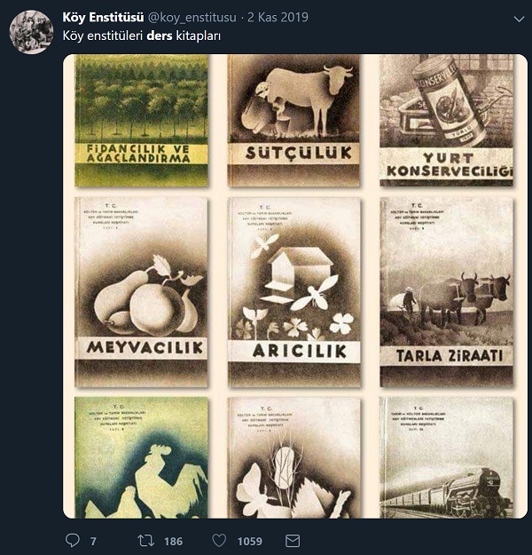 “65 yıl önce kapatılan köy enstitülerindeki ders kitaplarından bazıları. Derslere, konulara bakın… Şimdiki gençler pamukta fasulye bile çimlendiremiyor… Meyve ile sebzenin ayrımını bilmiyor. Fiziki durumu müsait okullarda, sera ve bahçeler oluşturulsa, öğrenciler toprakla uğraşsa, tarımı, hayvancılığı öğrense fena mı olur?”