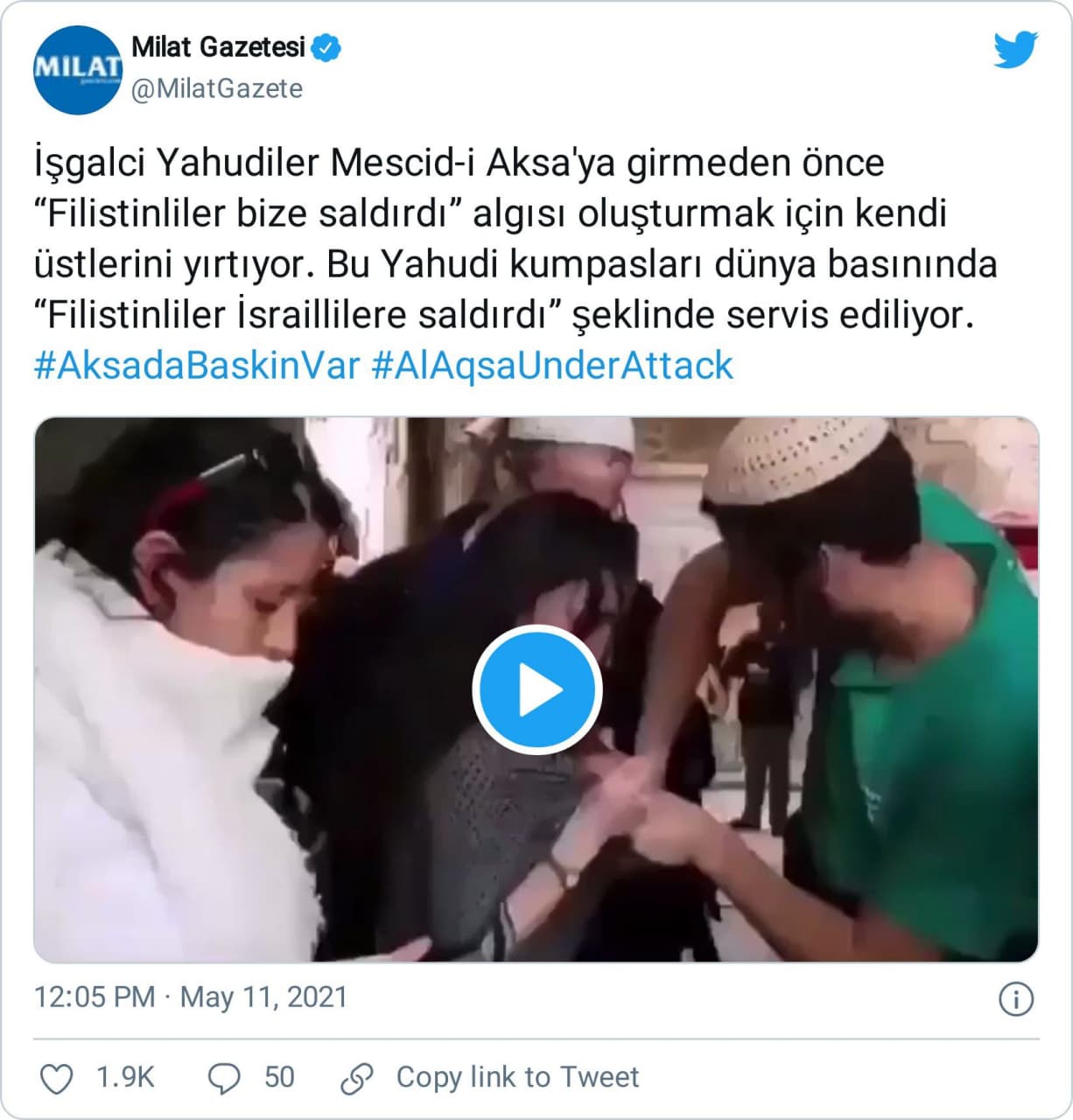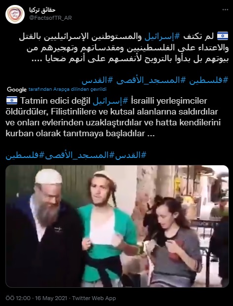 “İşgalci Yahudiler Mescid-i Aksa’ya girmeden önce “Filistinliler bize saldırdı” algısı oluşturmak için kendi üstlerini yırtıyor. Bu Yahudi kumpasları dünya basınında “Filistinliler İsraillilere saldırdı” şeklinde servis ediliyor.”