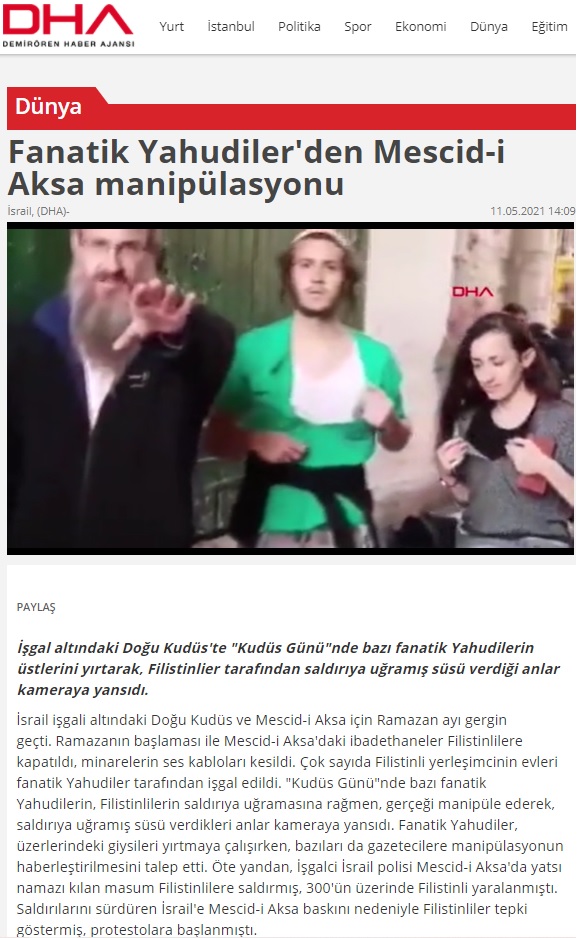 ” “Kudüs Günü”nde bazı fanatik Yahudilerin, Filistinlilerin saldırıya uğramasına rağmen, gerçeği manipüle ederek, saldırıya uğramış süsü verdikleri anlar kameraya yansıdı. Fanatik Yahudiler, üzerlerindeki giysileri yırtmaya çalışırken, bazıları da gazetecilere manipülasyonun haberleştirilmesini talep etti. “