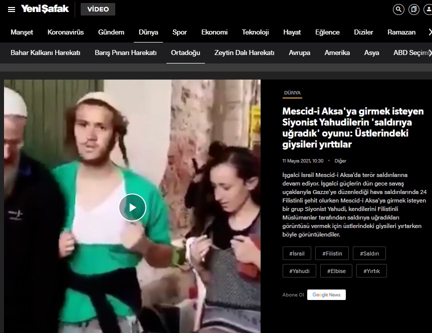 TGRT Haber’deki Cem Küçük ile Günaydın Türkiye adlı programda ise bu görüntü “Müslümanlar Bize Saldırdı Demek İçin Üstlerini Yırttılar” iddiasıyla / başlığıyla sunulmuştu. Cem Küçük “radikal Yahudilerden bakın görüntü geliyor Müslümanlar bize saldırdı demek için kendi üstlerini başlarını yırtarken kameraya yakalanıyorlar” ifadelerini kullandığı yayın kaydı şu şekilde: