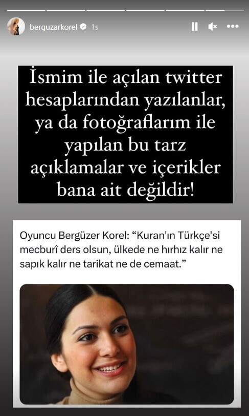 Bu süreçte Bergüzar Korel’in Instagram hesabında yapılan paylaşımda “İsmim ile açılan twitter hesaplarından yazılanlar, ya da fotoğraflarım ile yapılan bu tarz açıklamalar ve içerikler bana ait değildir!” ifadeleriyle bu iddia yalanlandı.