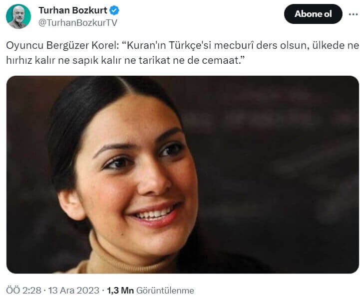 2024-2025 eğitim öğretim döneminden itibaren izlenecek müfredatta yapılacak değişikliklerin gündeme geldiği günlerde “Kuran’ın Türkçe’si mecburî ders olsun, ülkede ne hırhız kalır ne sapık kalır ne tarikat ne de cemaat.” sözü ünlü oyuncu Bergüzar Korel’e ait olduğu iddiasıyla sosyal medya platformlarında paylaşılmaya başlandı.