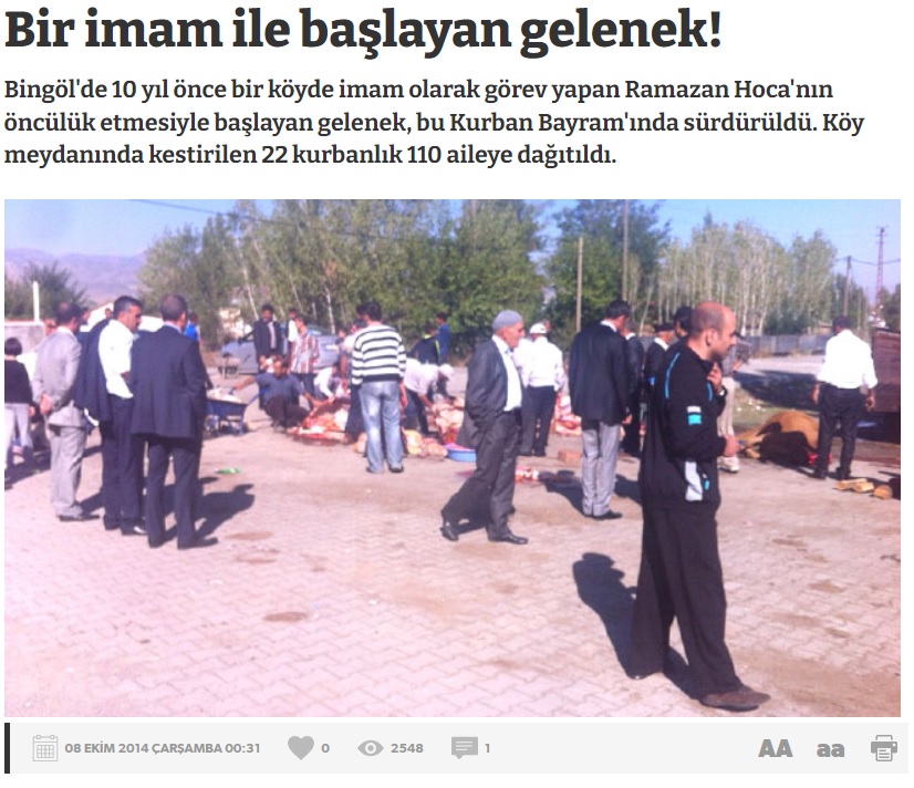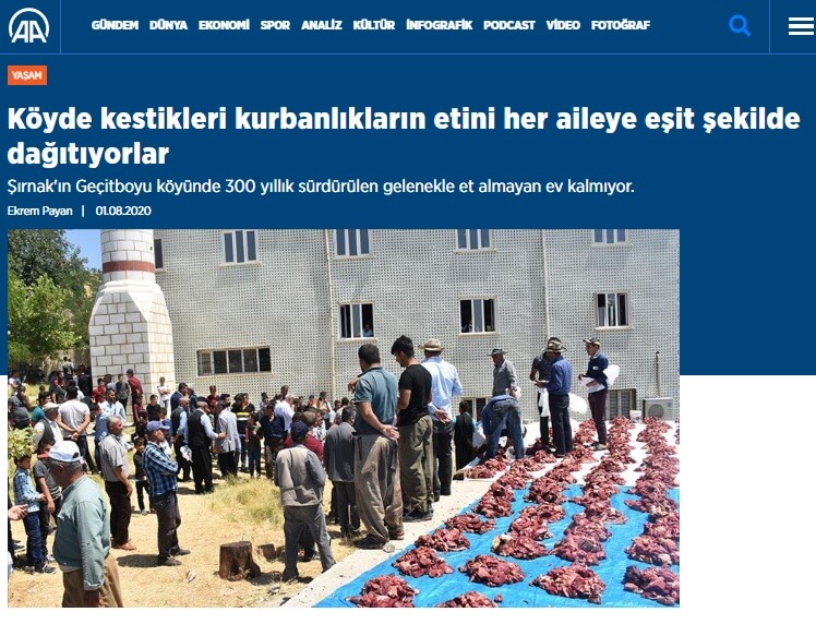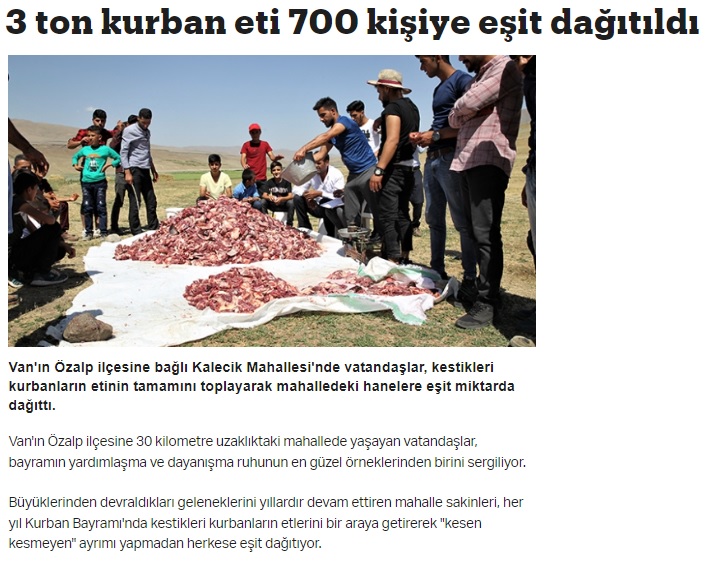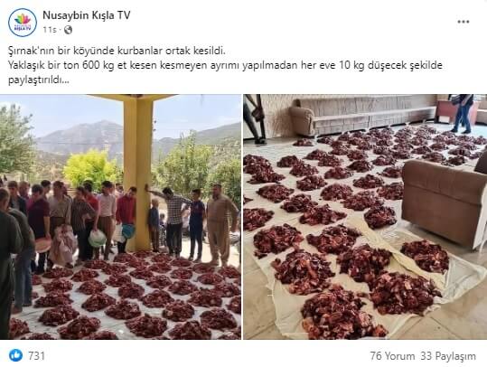 “Şırnak’nın bir köyünde kurbanlar ortak kesildi. Yaklaşık bir ton 600 kg et kesen kesmeyen ayrımı yapılmadan her eve 10 kg düşecek şekilde paylaştırıldı…”