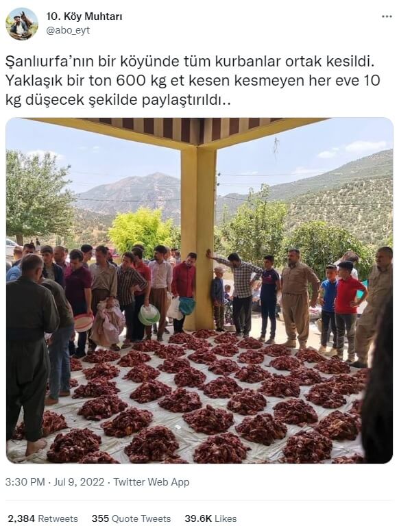 “Şanlıurfa’nın bir köyünde tüm kurbanlar ortak kesildi. Yaklaşık bir ton 600 kg et kesen kesmeyen her eve 10 kg düşecek şekilde paylaştırıldı..”