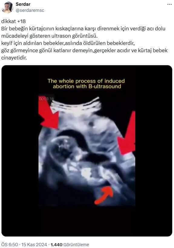 Serdar (@serdaremsc): “dikkat +18 Bir bebeğin kürtajcının kıskaçlarına karşı direnmek için verdiği acı dolu mücadeleyi gösteren ultrason görüntüsü. keyif için aldırılan bebekler,aslında öldürülen bebeklerdir, göz görmeyince gönül katlanır demeyin,gerçekler acıdır ve kürtaj bebek cinayetidir.”