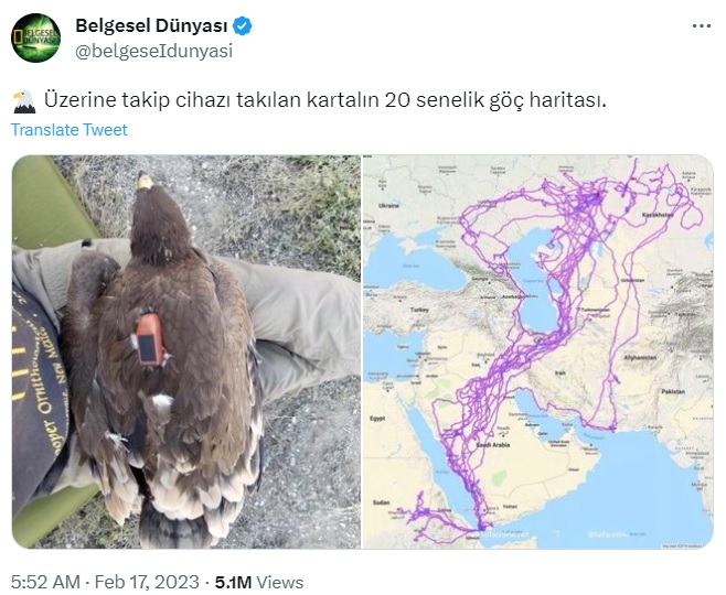 Belgesel Dünyası (@belgeseIdunyasi): “🦅 Üzerine takip cihazı takılan kartalın 20 senelik göç haritası.”
