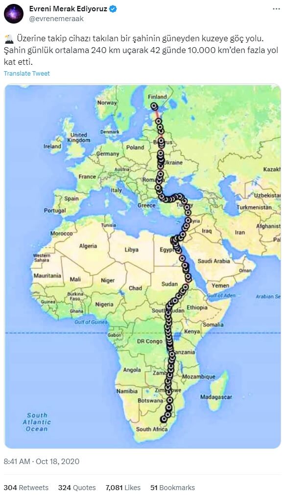 Evreni Merak Ediyoruz (@evrenemeraak): “🦅 Üzerine takip cihazı takılan bir şahinin güneyden kuzeye göç yolu. Şahin günlük ortalama 240 km uçarak 42 günde 10.000 km’den fazla yol kat etti.”