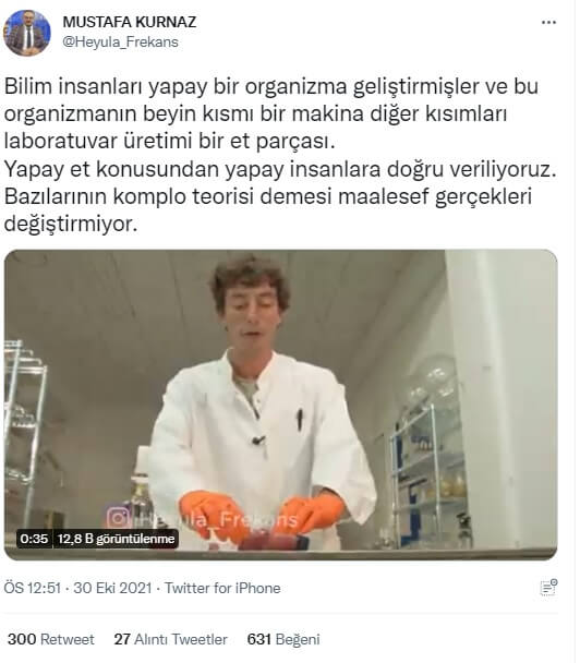 “Bilim insanları yapay bir organizma geliştirmişler ve bu organizmanın beyin kısmı bir makina diğer kısımları laboratuvar üretimi bir et parçası. Yapay et konusundan yapay insanlara doğru veriliyoruz. Bazılarının komplo teorisi demesi maalesef gerçekleri değiştirmiyor.”